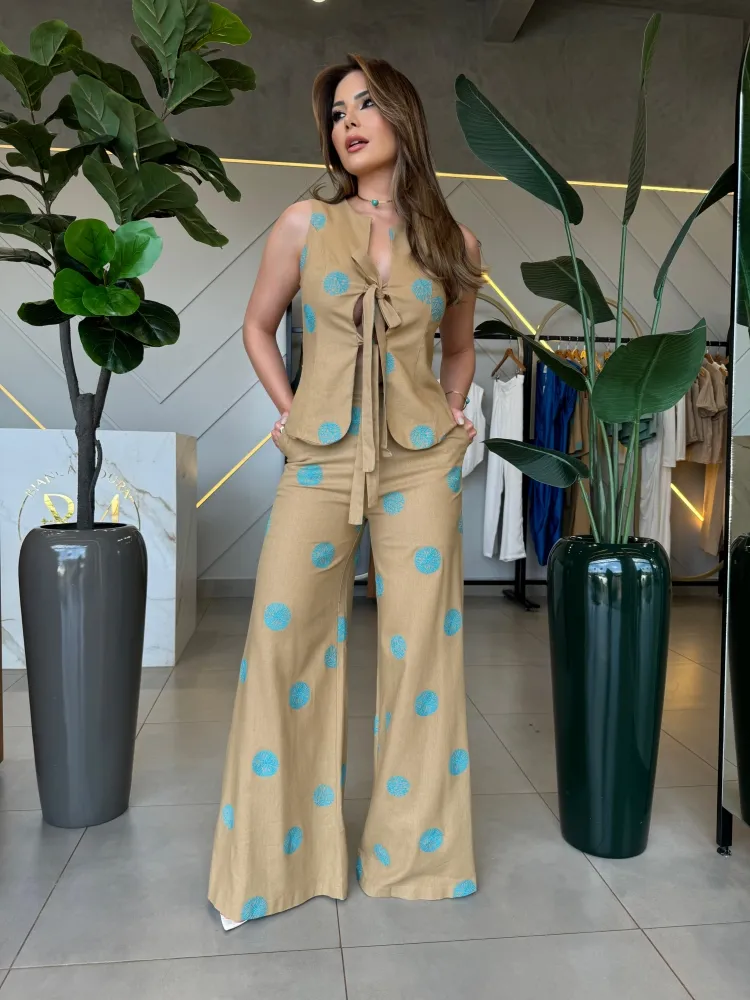 Esta calça pantalona, confeccionada em tecido bordado,
