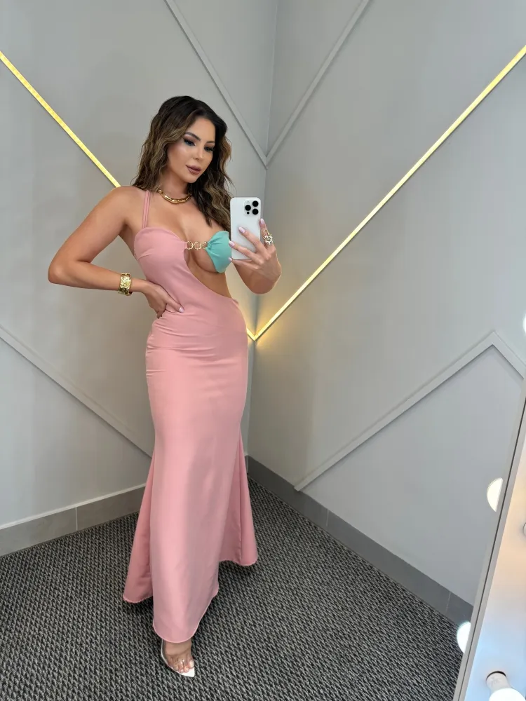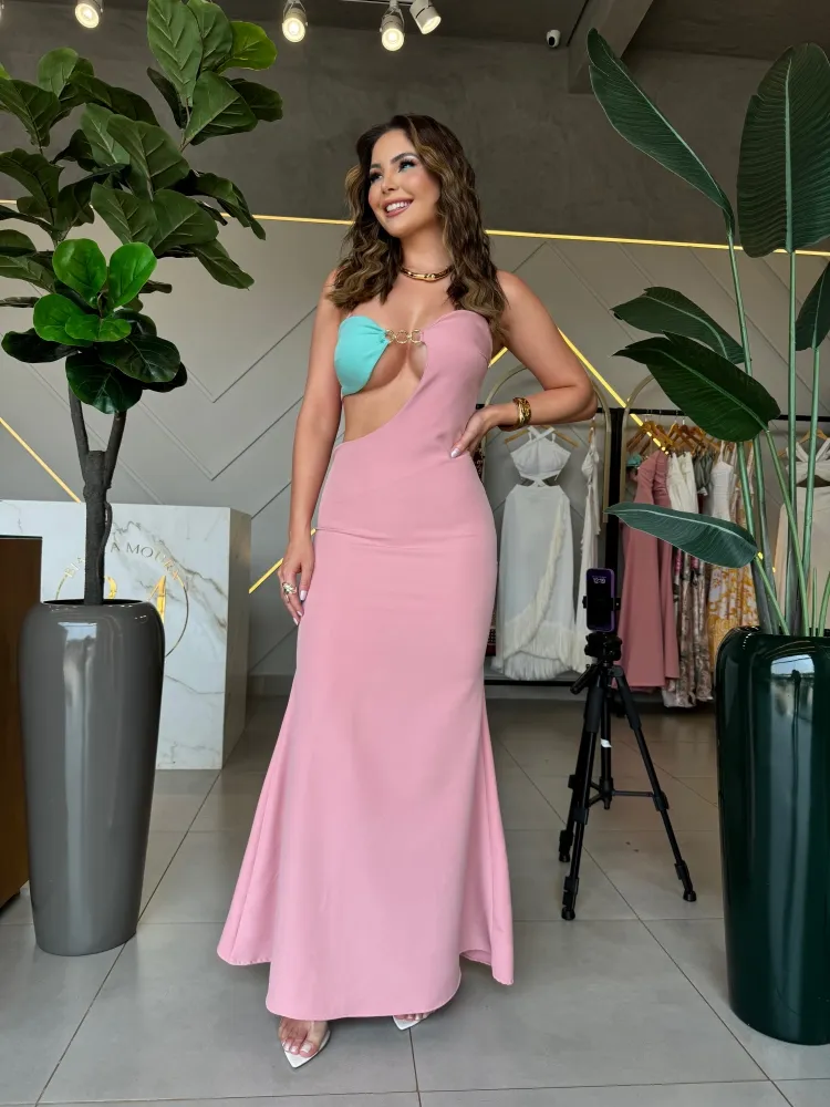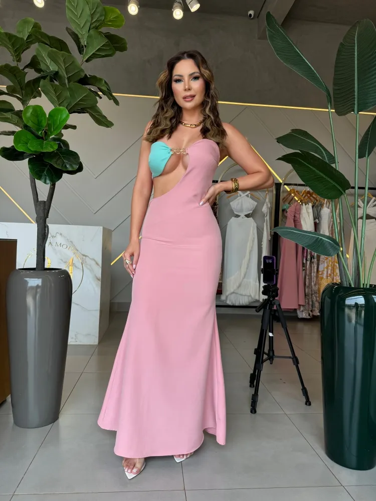 O vestido Divva é para as fashionistas cansadas da mesmice. Um vestido com recortes assimétricos e fechamento em argolas no centro do top que fica bem estruturado, contém bojo embutido e com regulagem na alça no pescoço. Nas costas tem fechamento em zíper.